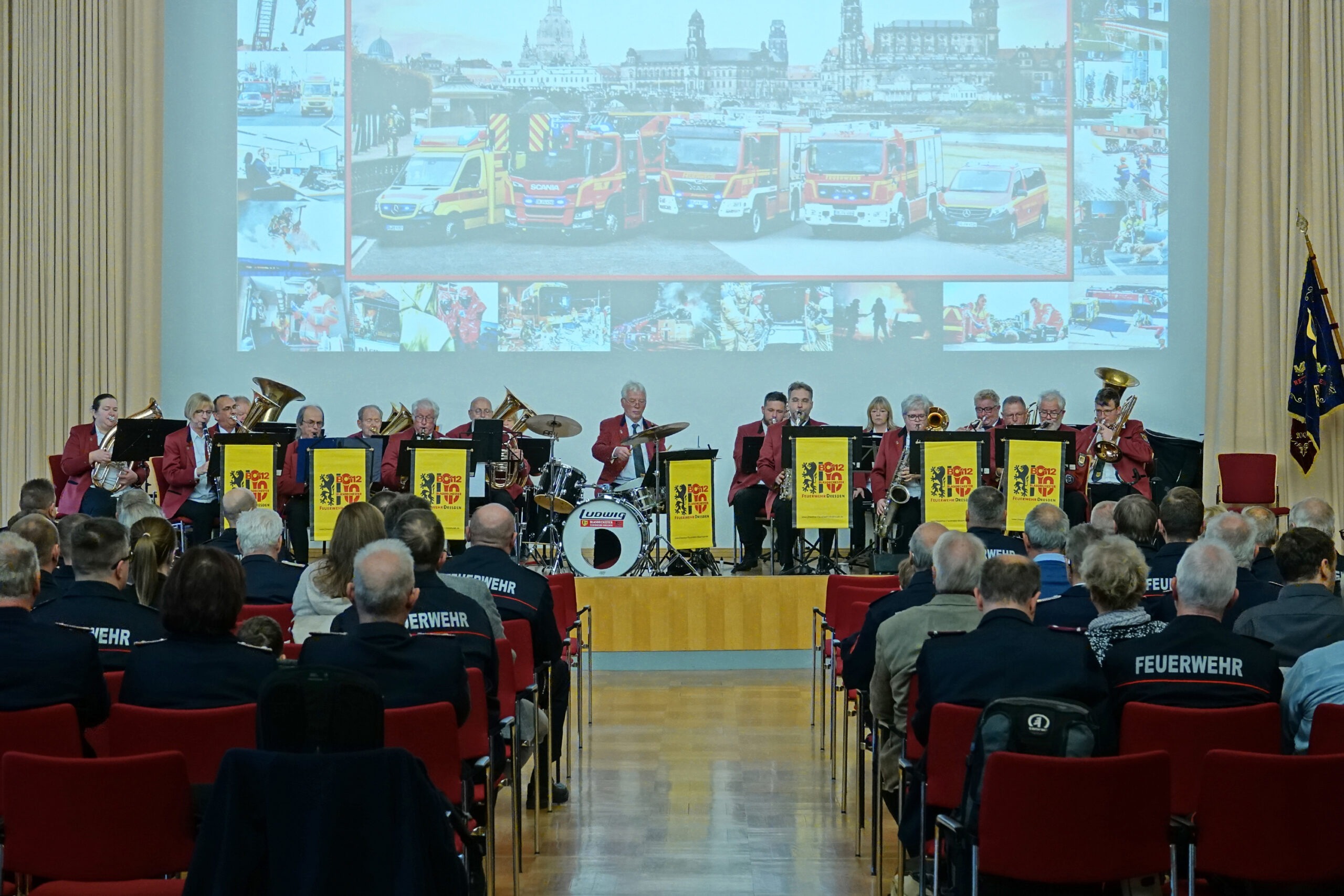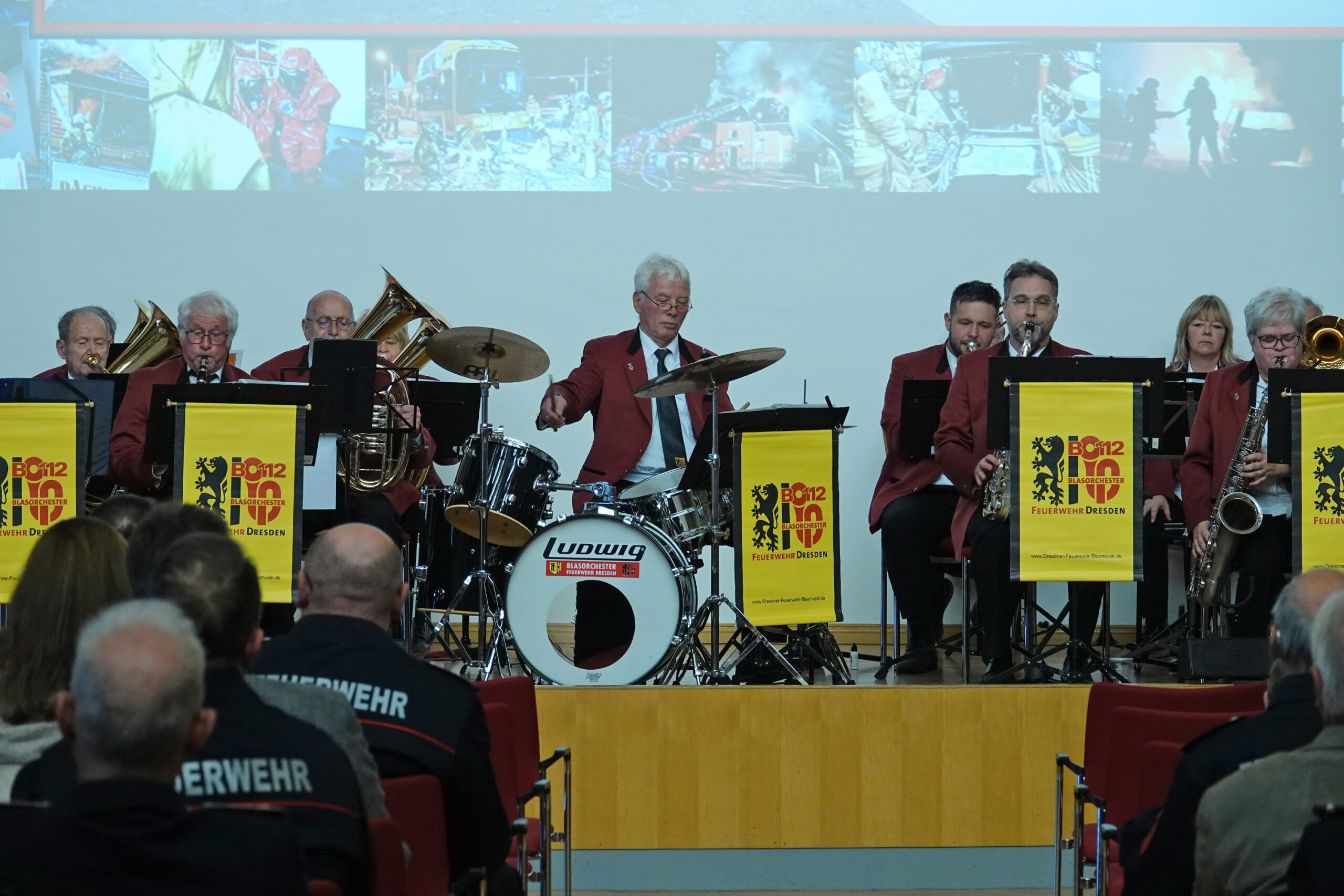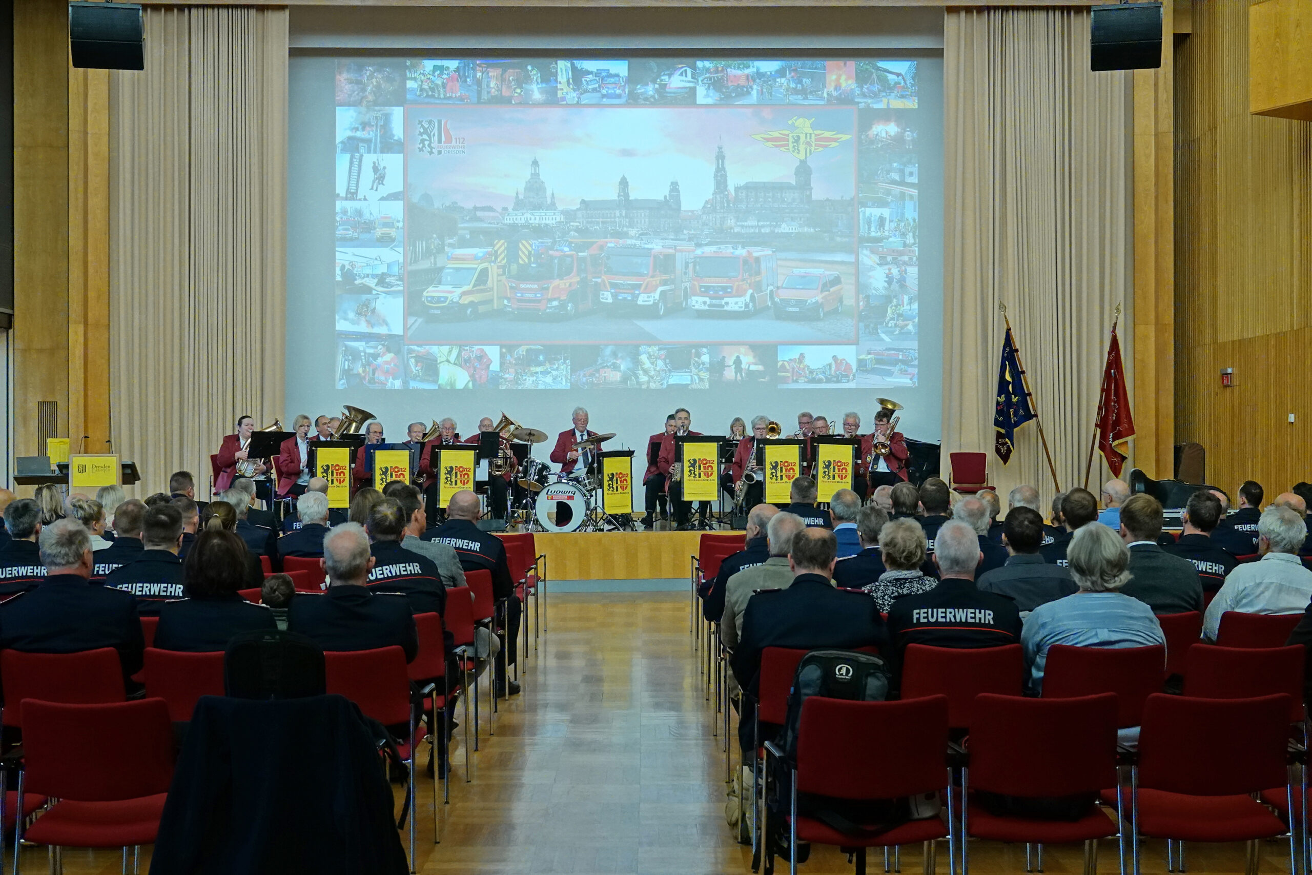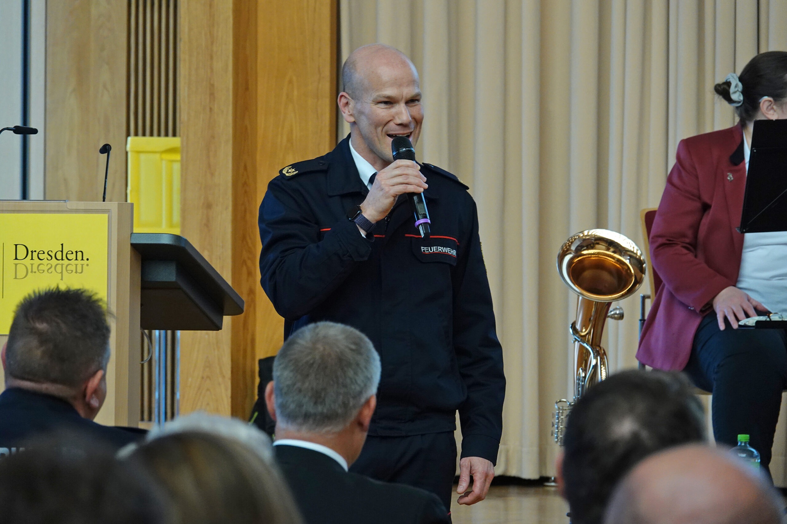 Nach einem musikalischen Auftakt durch das Feuerwehrblasorchester „BO 112“ begrüßten der Vorsitzende des SFV Dresden e. V. Kamerad Carsten Löwe und der Leiter der Feuerwehr Dresden Dr. Michael Katzsch die eingeladenen Dresdner Feuerwehrleute und alle Gäste.