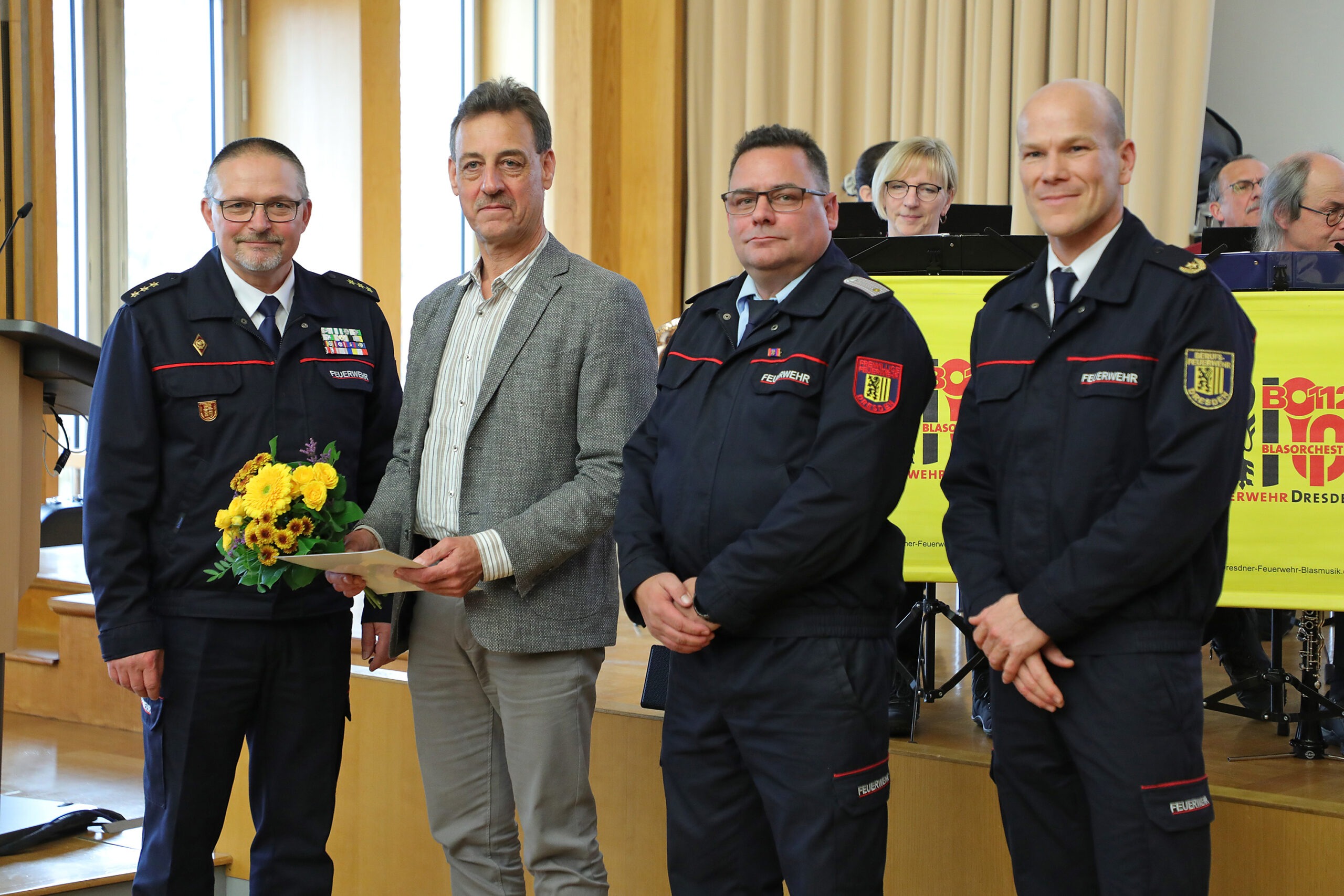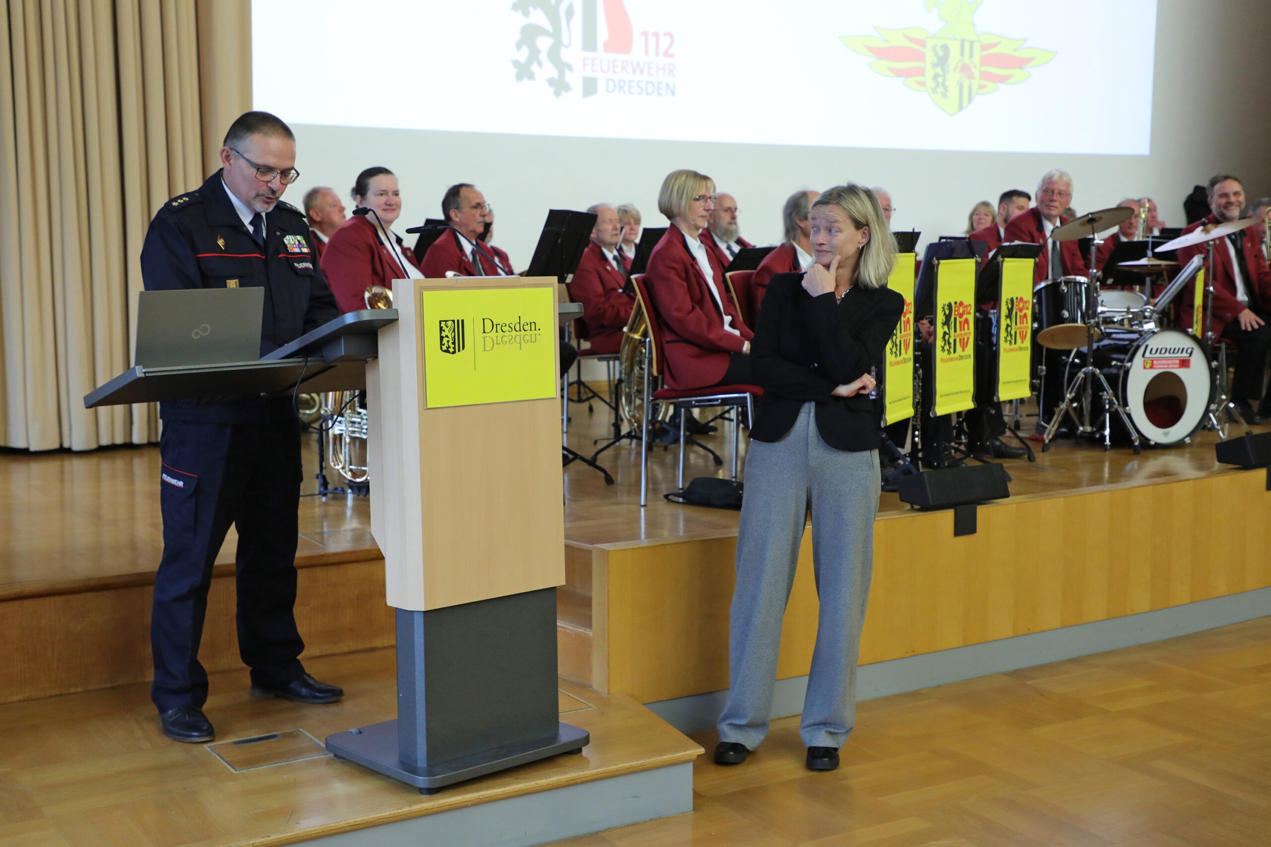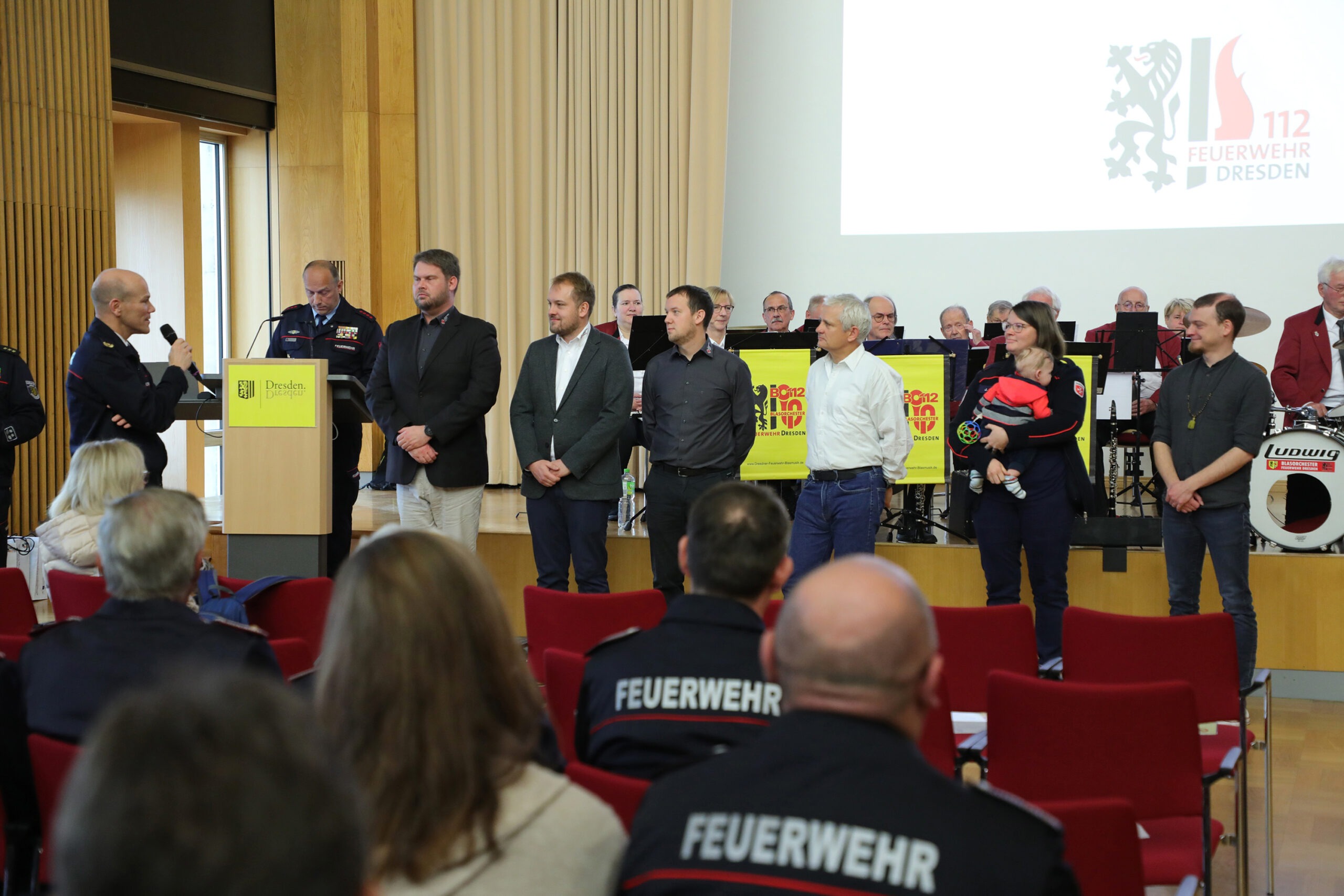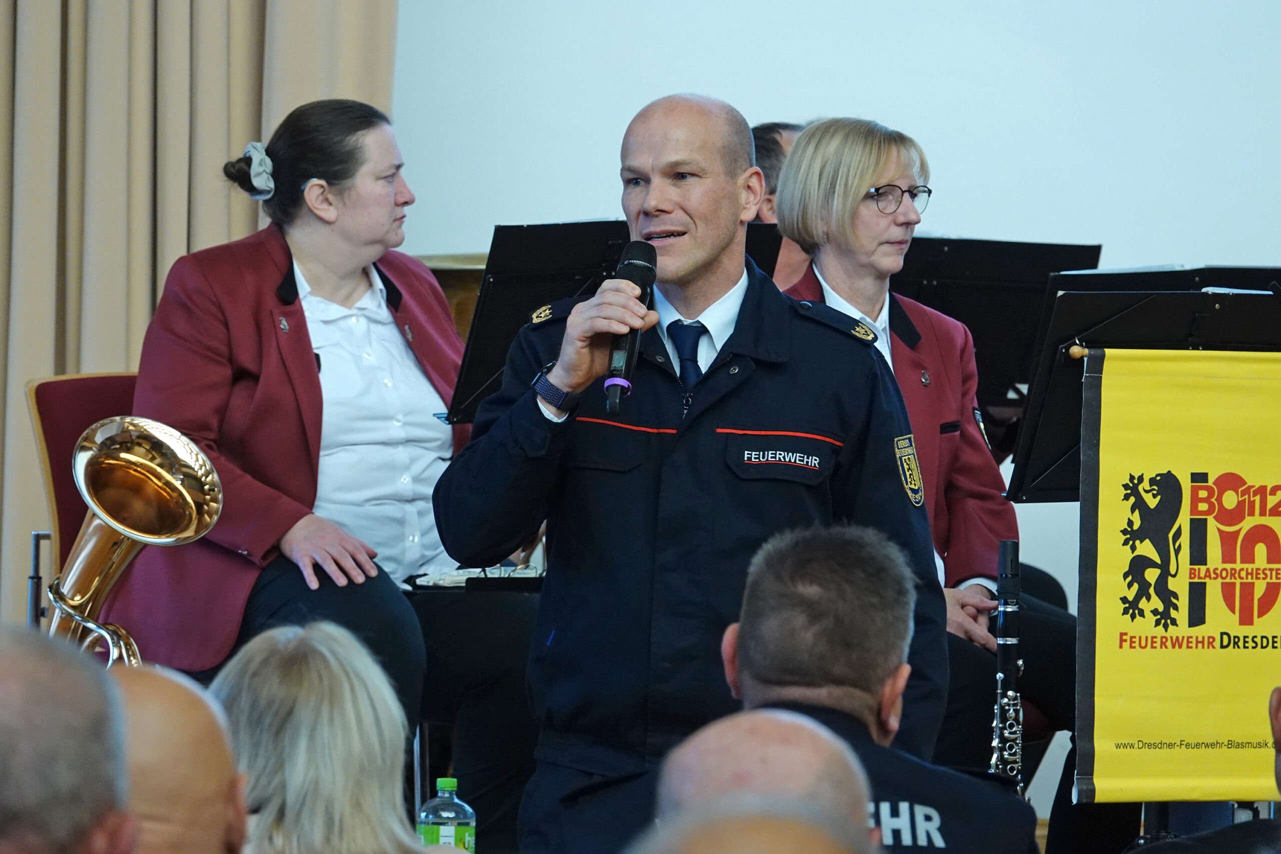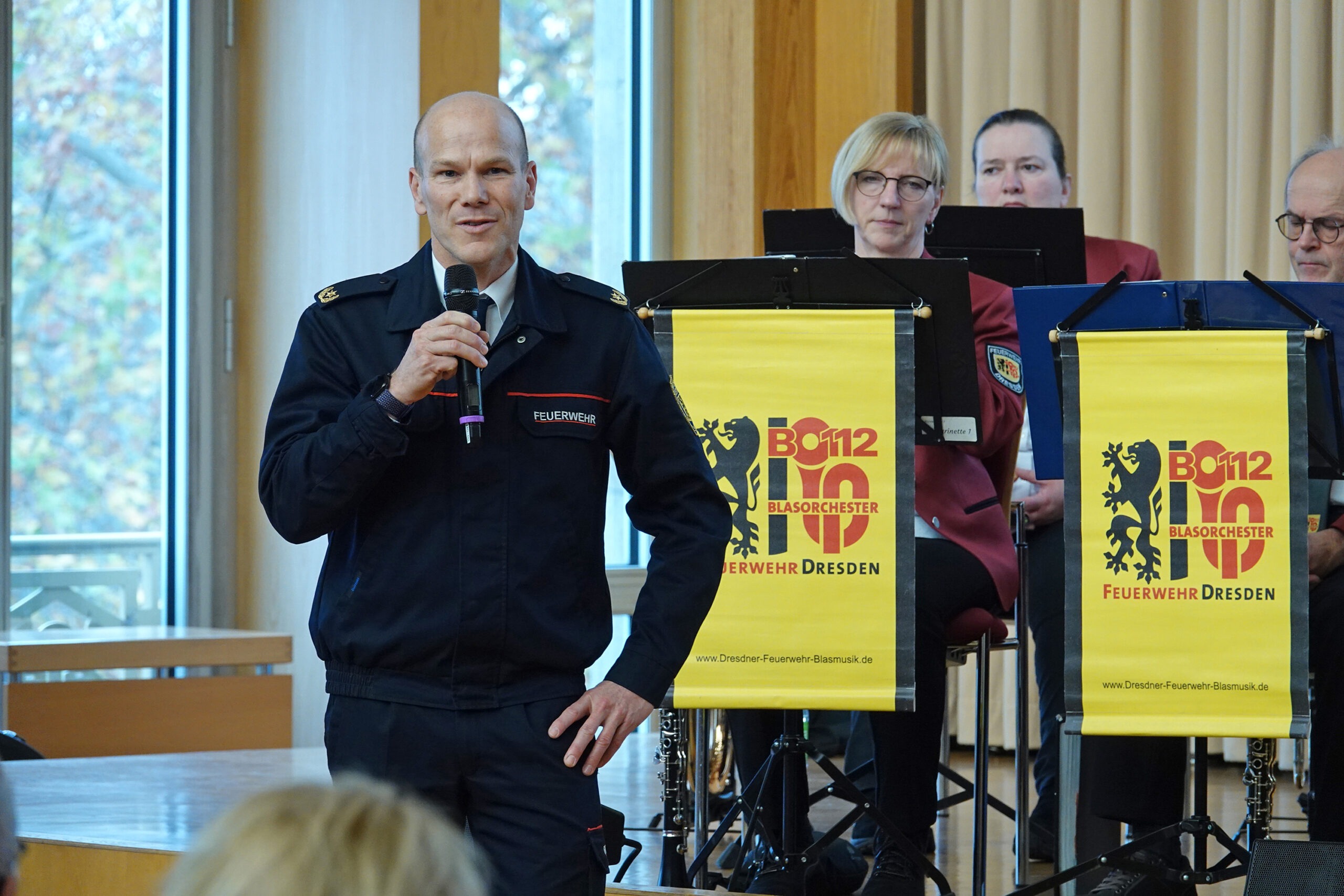 Nach einem musikalischen Auftakt durch das Feuerwehrblasorchester „BO 112“ begrüßten der Vorsitzende des SFV Dresden e. V. Kamerad Carsten Löwe und der Leiter der Feuerwehr Dresden Dr. Michael Katzsch die eingeladenen Dresdner Feuerwehrleute und alle Gäste.