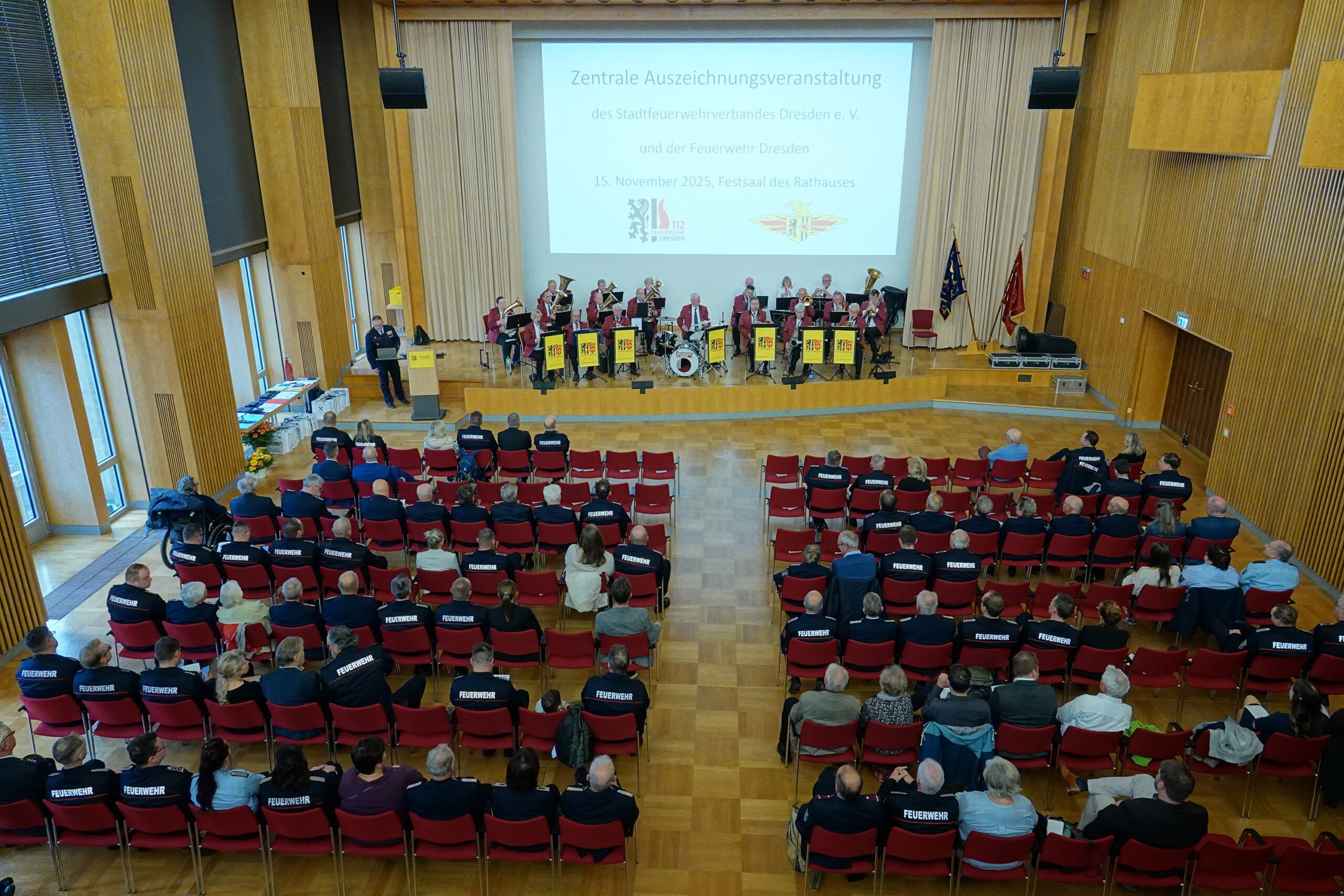 Am Samstag, den 15. November 2025 luden der Stadtfeuerwehrverband Dresden e. V. und die Feuerwehr Dresden zur zentralen Auszeichnungsveranstaltung 2025 in den Plenar- und Festsaal des Neuen Rathauses Dresden ein.