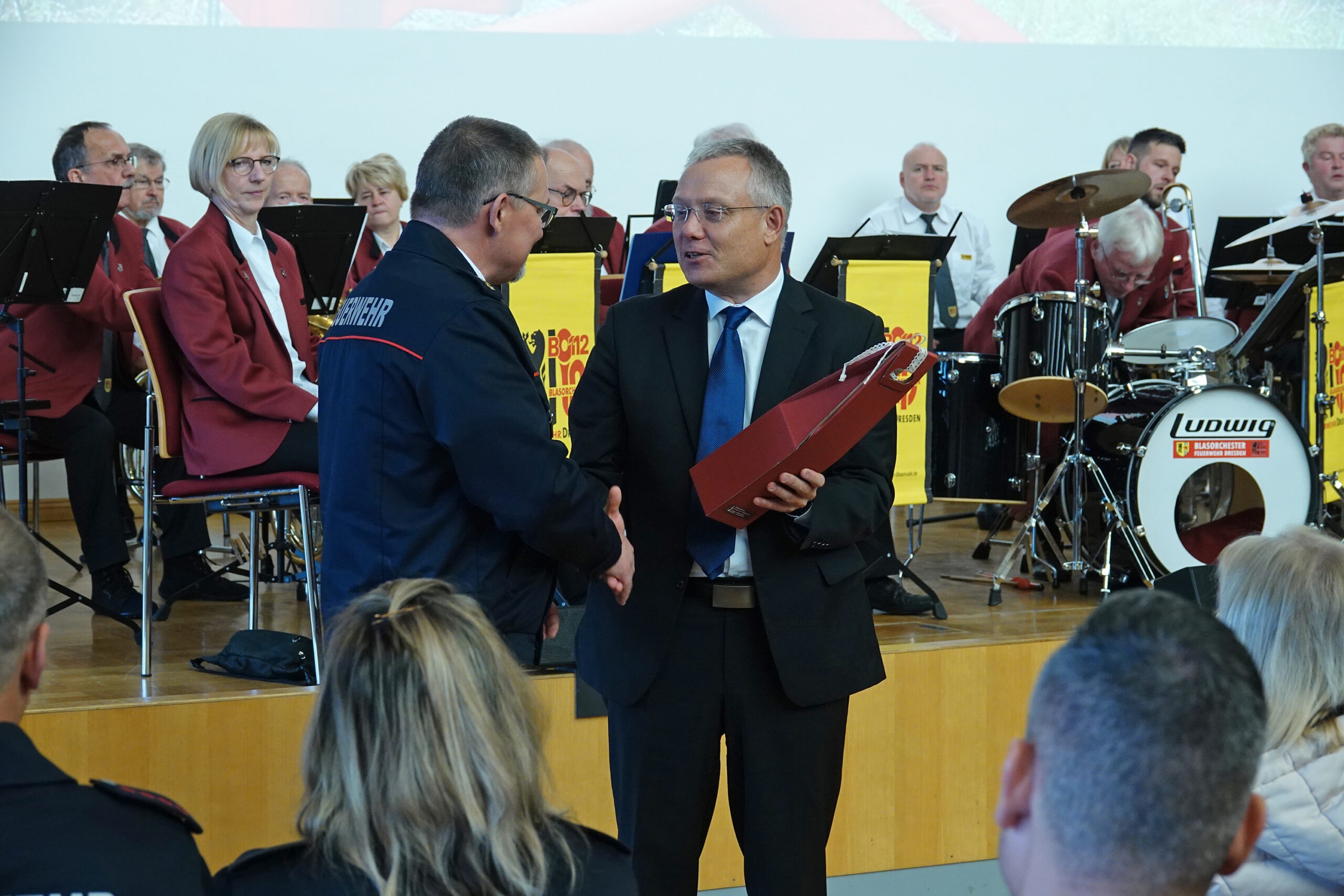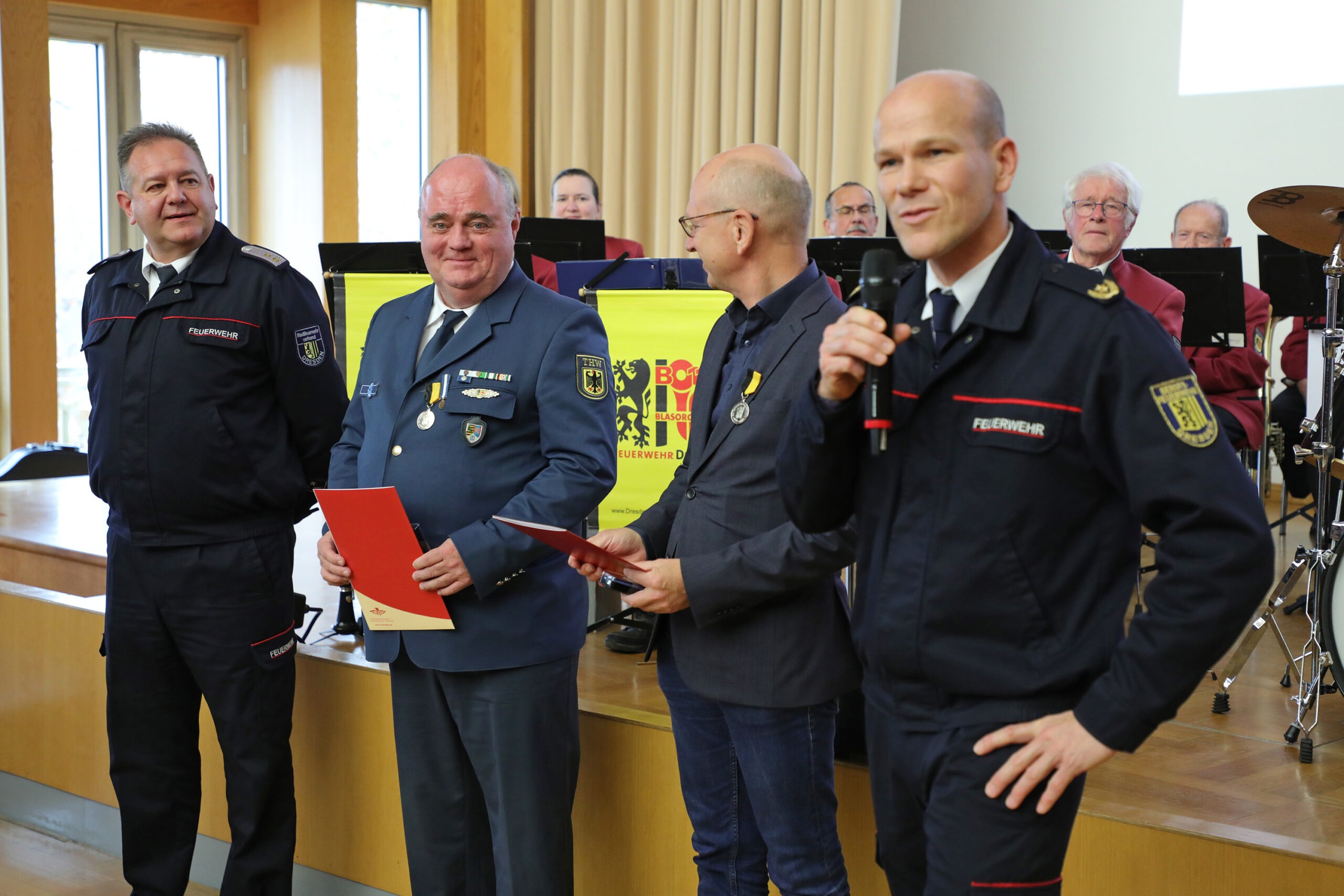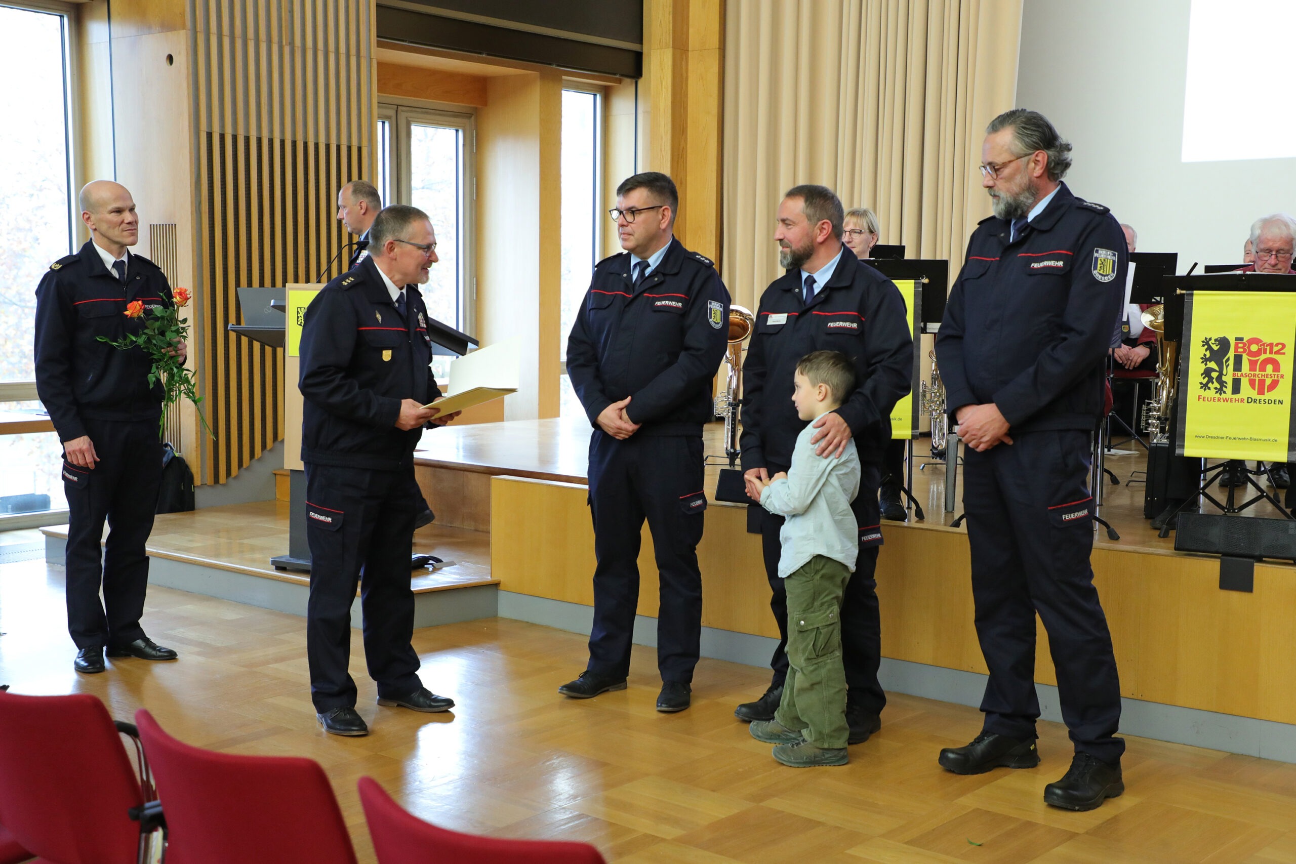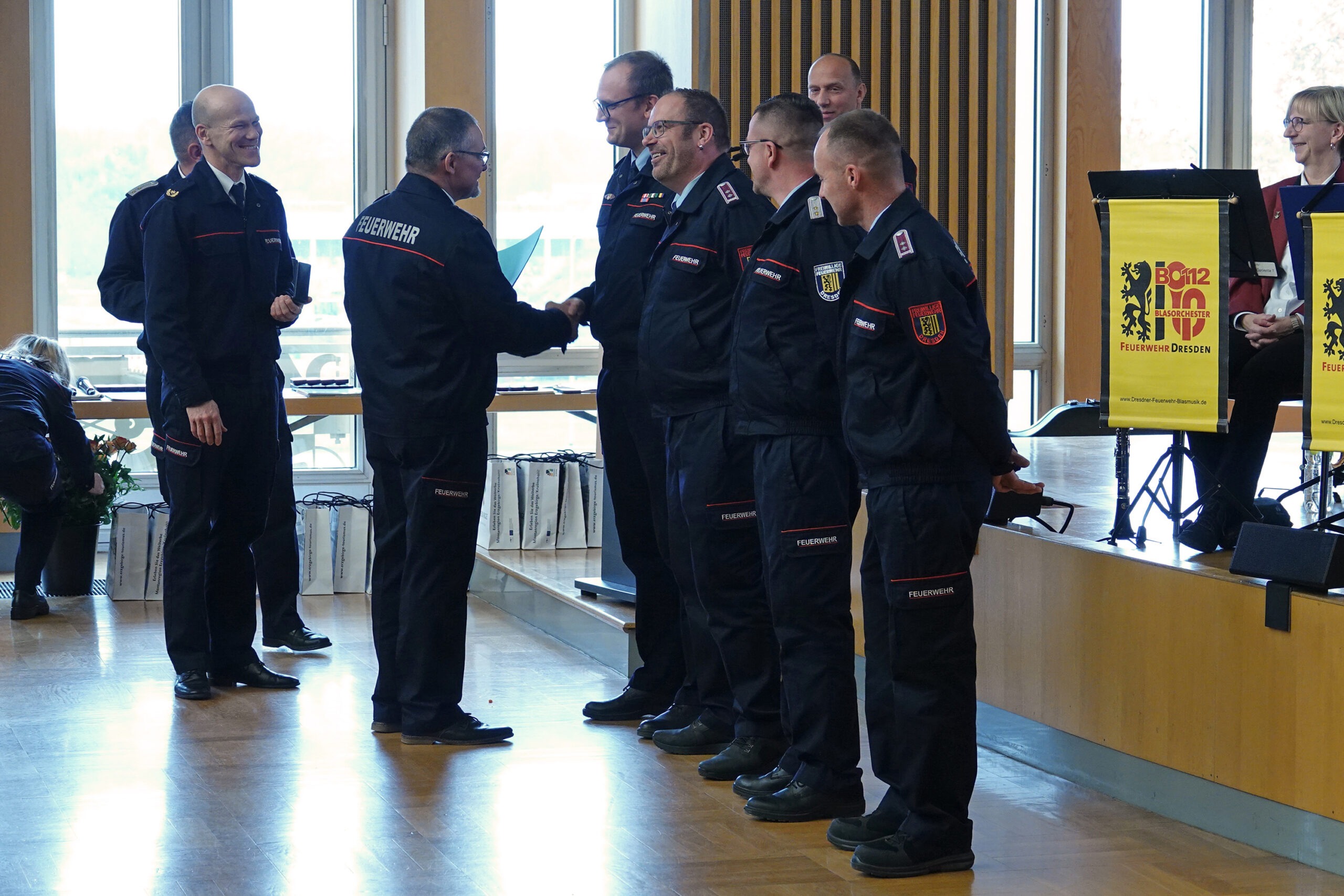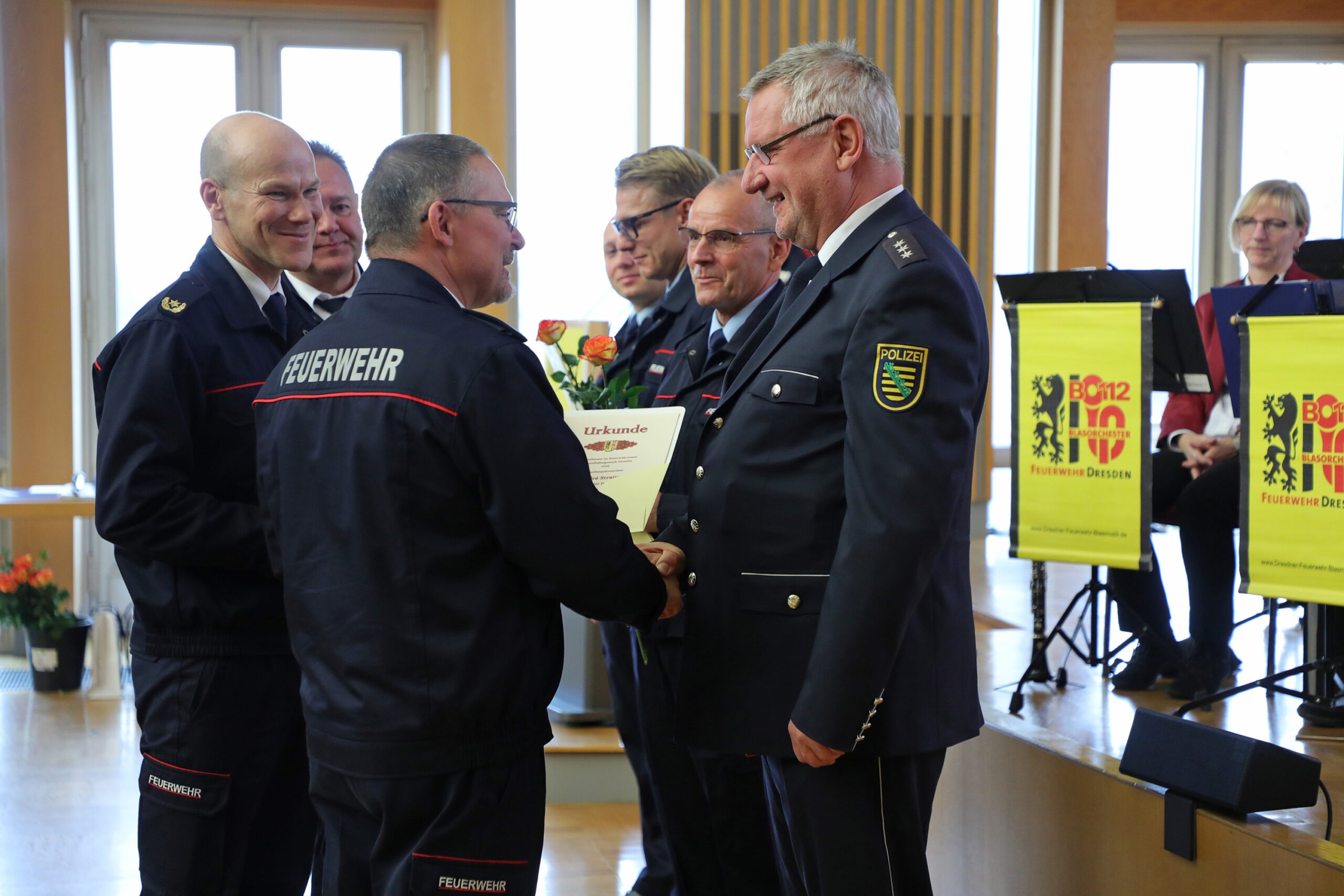 Umrahmt von den Musikstücken unseres „BO 112“ wurden verdienstvolle Kameradinnen und Kameraden ausgezeichnet. Geehrt wurden auch Kameradinnen und Kameraden der Dresdner Hilfsorganisationen, des Technischen Hilfswerks und der Dresdner Polizei.