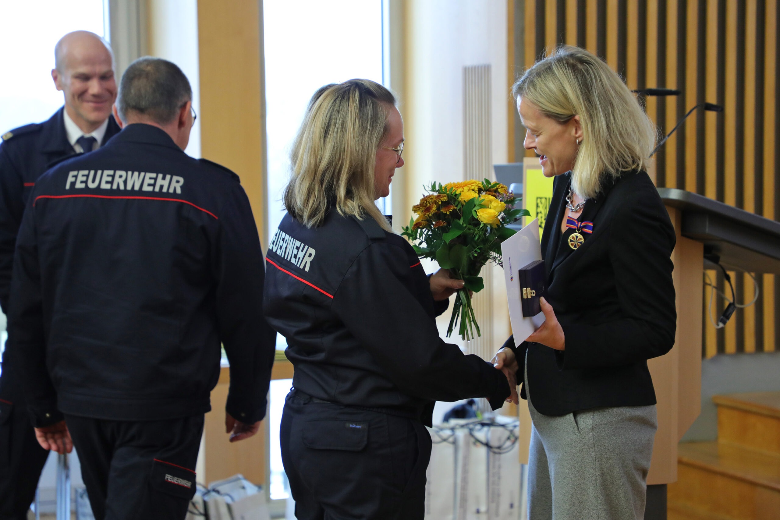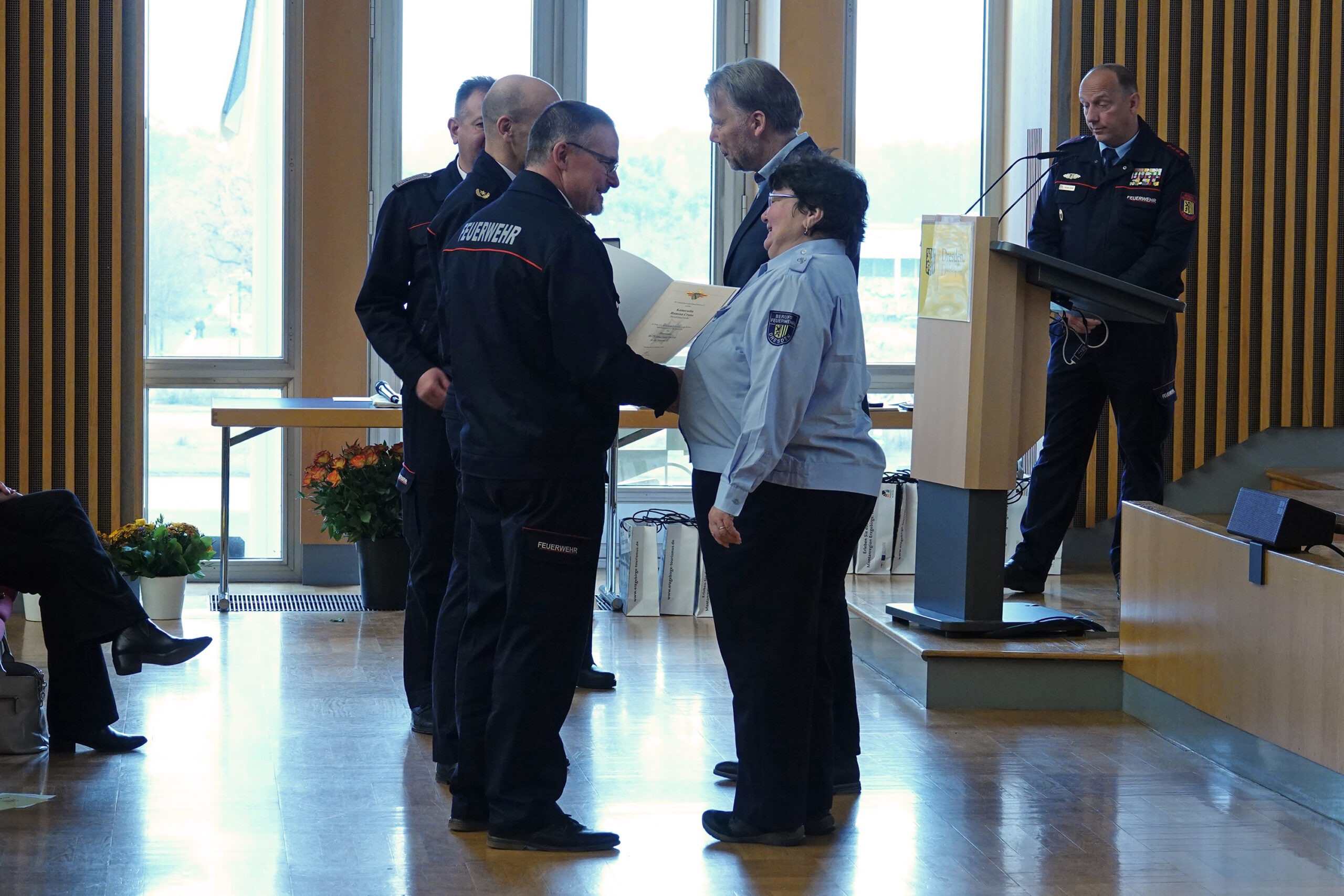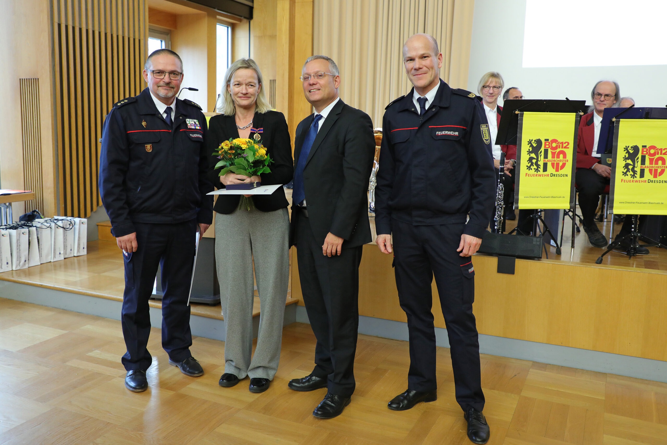 Als besondere Ehrung des Deutschen Feuerwehrverbandes überreichte der Vorsitzende Carsten Löwe an die Referentin des Bürgermeisters Frau Kathrin Liskowsky für ihr langjähriges und erfolgreiches Wirken im Interesse der Dresdner Feuerwehren und unseres Verbandes die Deutsche Feuerwehr-Ehrenmedaille.